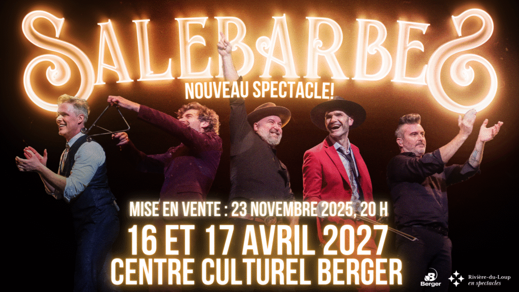 L’équipe de Rivière-du-Loup en spectacles est heureuse de présenter le nouveau spectacle des Salebarbes les 16 et 17 avril 2027, à 20 h, au Centre culturel Berger.